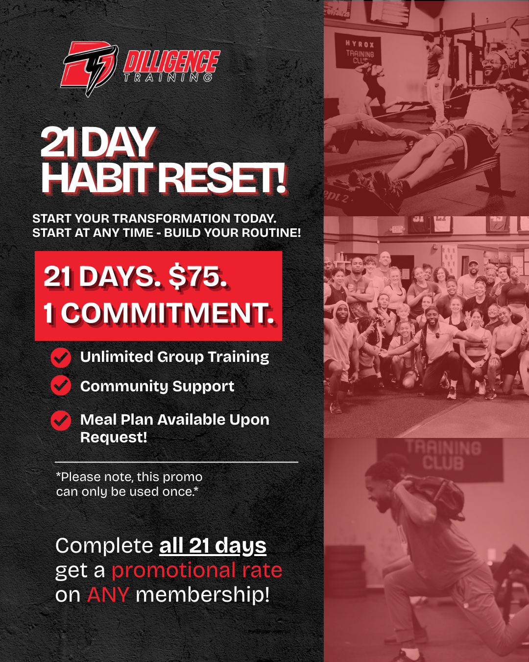 This is a 21 day reset designed to help you rebuild habits through structure, consistency, and community support. If you have been off track or need momentum, this is your simple start.